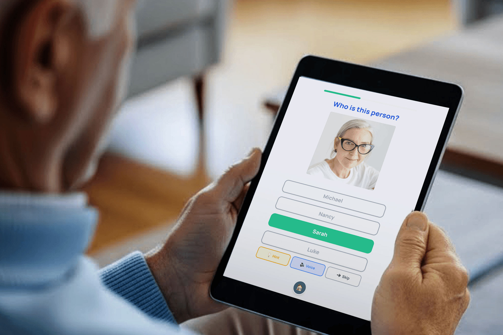 I reimagined game mechanics entirely. No timers, no scores, no "wrong" feedback. Incorrect answers receive a gentle "Let's try again" with the photo still visible. Unlimited attempts until success. Progress framed as "You recognised 8 family members today!" rather than percentages. Every interaction preserves self-worth.