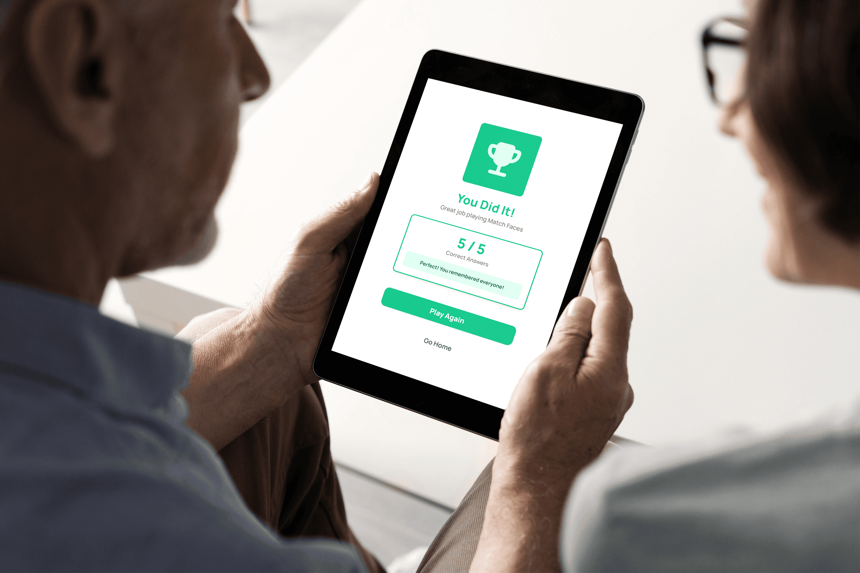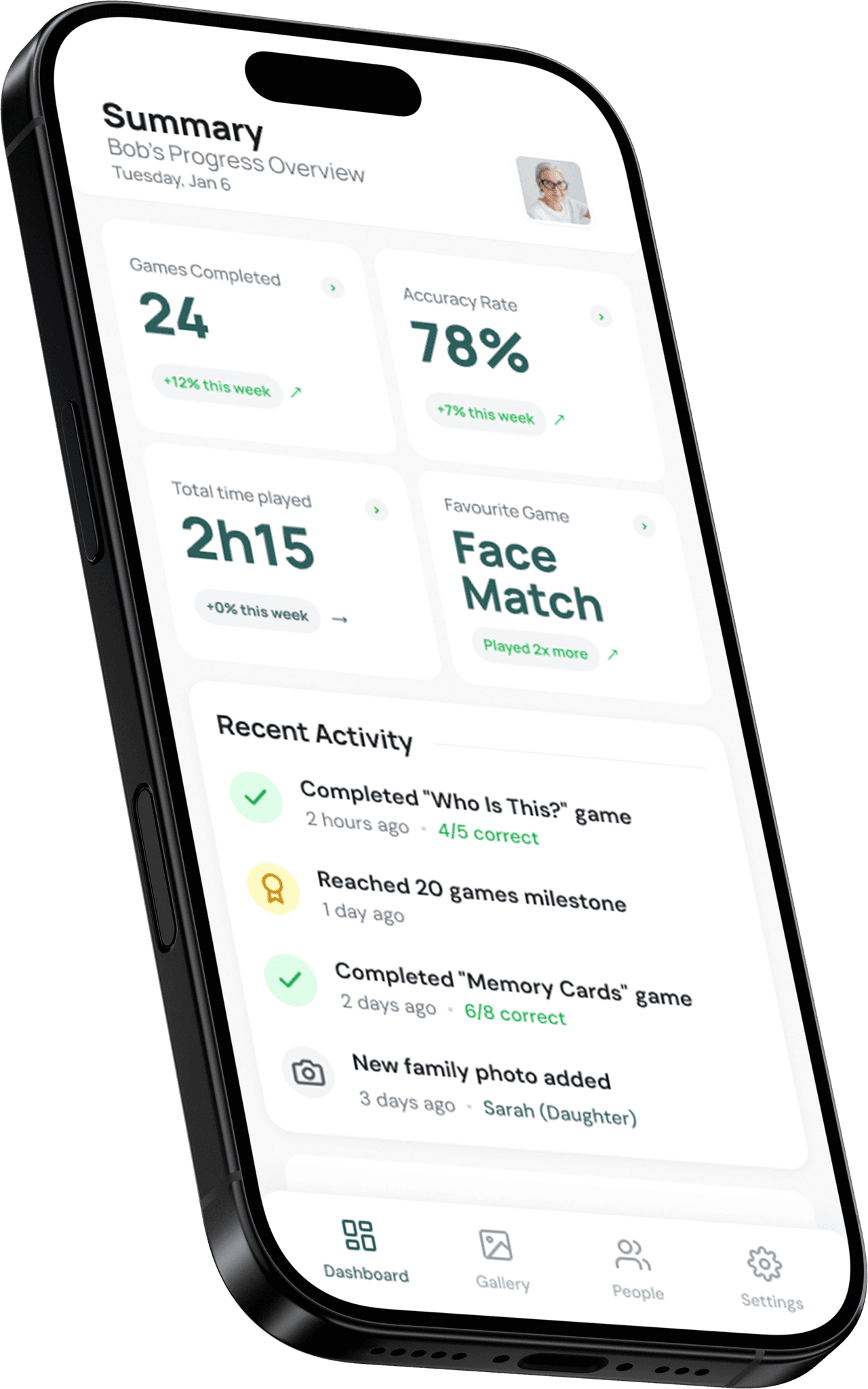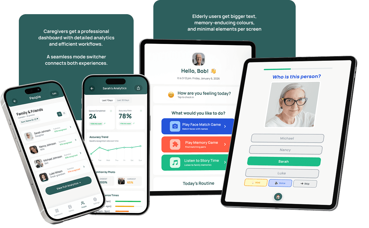 A dual-audience mobile app that helps people with dementia recognize family through engaging games, while empowering caregivers to manage care and track progress.